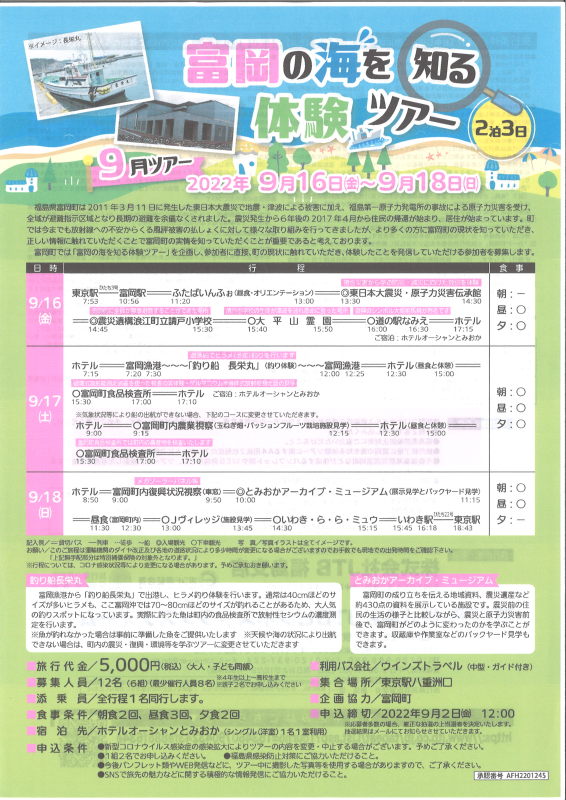 福島県富岡町は2011年3月11日に発生した東日本大震災で地震・津波による被害に加え、福島第一原子力発電所の事故による原子力災害を受け全域が避難指示区域となり長期の避難を余儀なくされました。震災発生から6年後の2017年4月から住民の帰還がはじまり居住が始まっています。町では今までも放射線の不安からくる風評被害の払拭に対して様々な取り組みを行ってきましたが、より多くの方に富岡町の現状を知っていただき、正しい情報に触れていただくことで富岡町の実情を知っていただくことが重要であると考えております。富岡町では「富岡町の海を知る体験ツアー」を企画し、参加者に直接、町の現状に触れていただき、体験したことを発信していただける参加者を募集します。