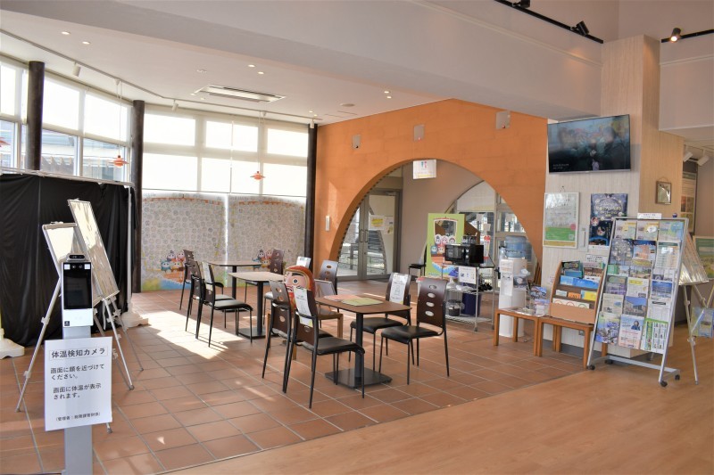 広々としたスペース。 電車の待ち時間や、休憩に。 検温、アルコール消毒液を設置し、換気を行っています。 安心してご利用ください。