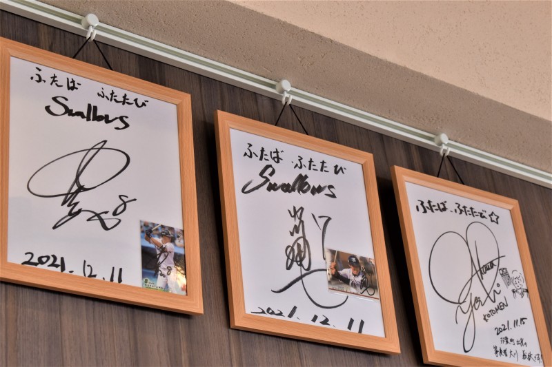 ヤクルトスワローズの内川聖一選手と中山翔太選手 双葉町出身の箏奏者、大川義秋さんのサインが飾られています。