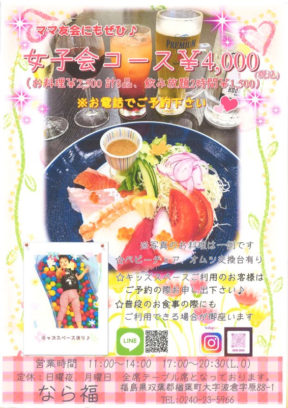 女子会コース¥4,000(税込)‼️ 出来ました✨ (内、お料理¥2,500、計8品+飲み放題2時間¥1,500) ※お電話でのご予約お願いします ※写真は一例なのでその時によってメニューは変わります ・お酒を楽しく飲みたい❣️ ・ストレス発散したい❣️ ❤️ママ友会してみたいけど、子供を預ける人がいない…そんなご心配は無用‼️ 子供連れて来ちゃえ〜笑 ⭐️キッズスペース有り ⭐️ベビーチェア、オムツ交換台有り などなど、女性グループでの飲み会大歓迎♡ 全てお電話でお気軽にお尋ね下さい! ※送迎、キッズスペース、ボールプールご利用の際は事前にお申し出下さい。