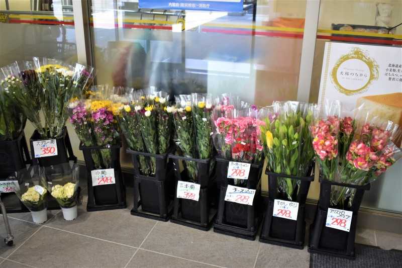 コンビニ正面入口で生花の販売を始めました。