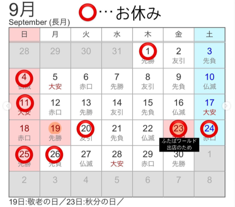9月の営業カレンダー