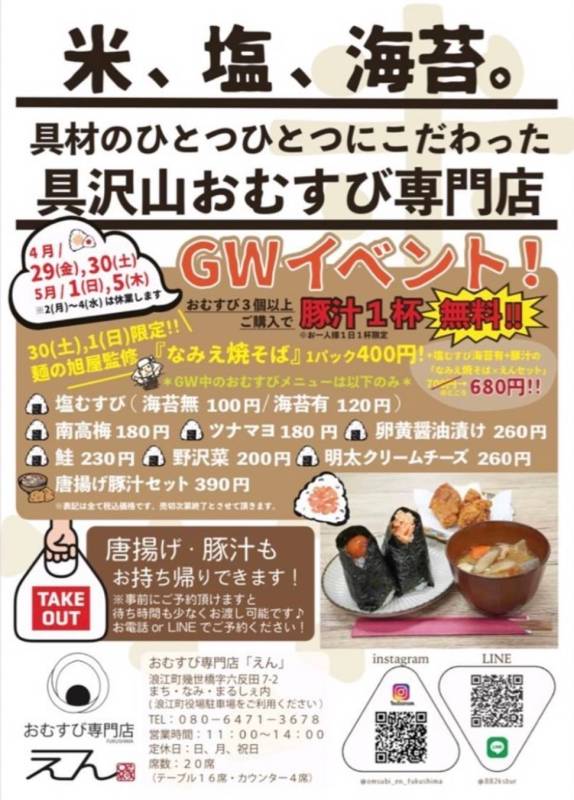 GW営業期間中、おむすび3個以上ご購入で、具沢山豚汁180円が無料!