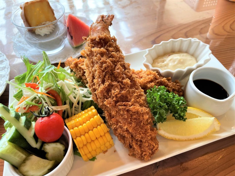 ○ランチ ジャンボエビフライ(ライス、デザート付き)1,550円 食べごたえバッチリ!どでかいぷりっぷりなエビフライ♪