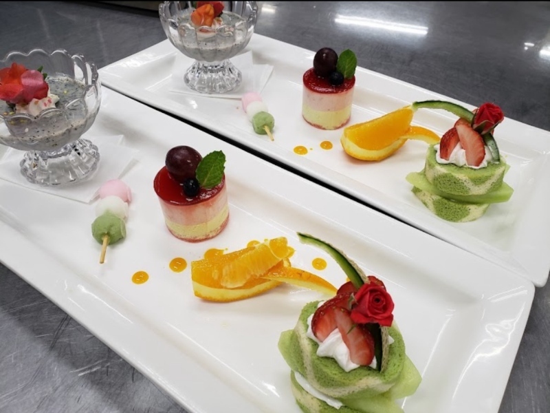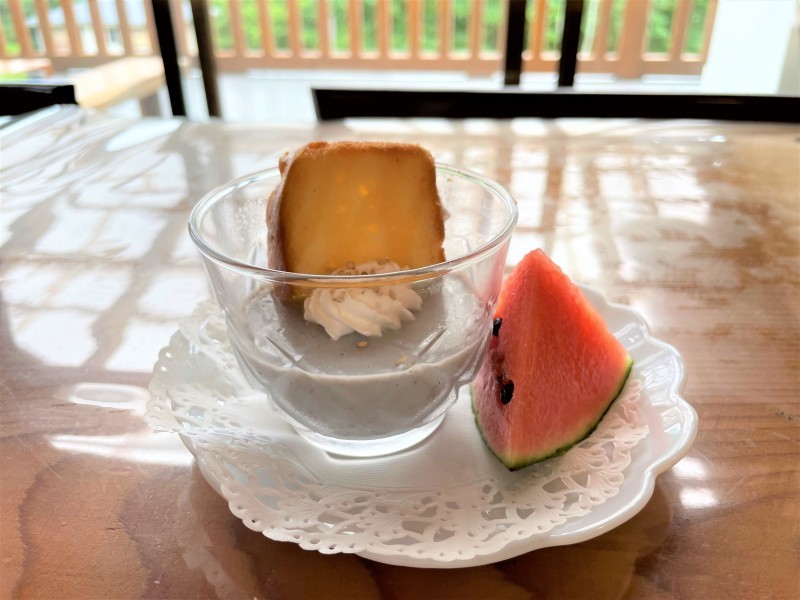 ○ランチデザート 優しい甘さの黒ごまプリンにパウンドケーキを乗せて。 季節のフルーツ付きで贅沢に