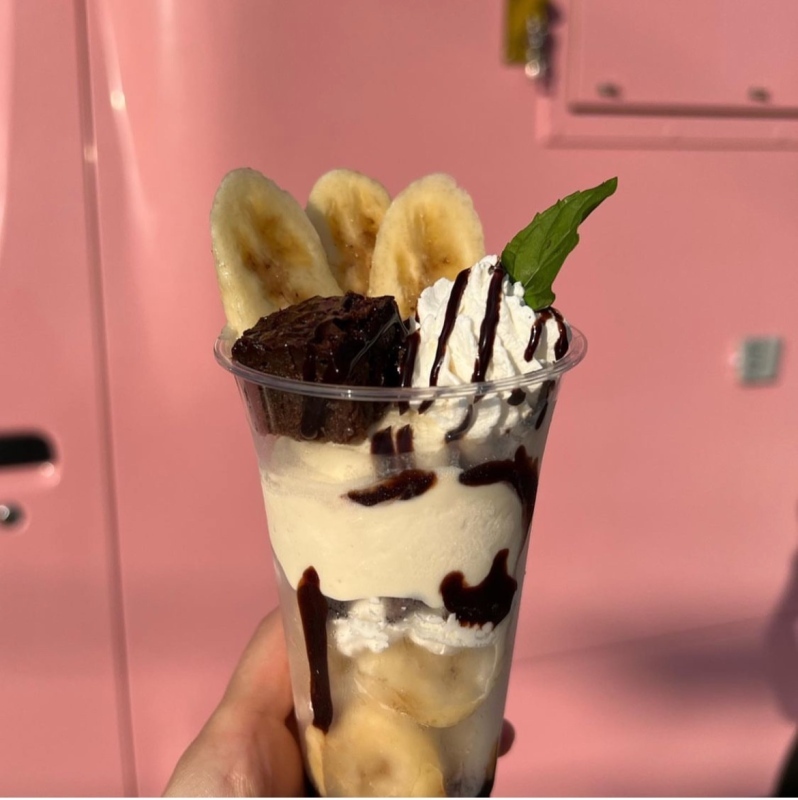 ○チョコバナナパフェ バナナ×チョコの最強の組み合わせと隠れたチョコチップのアクセントがポイントです! 年間を通してお楽しみいただけます。