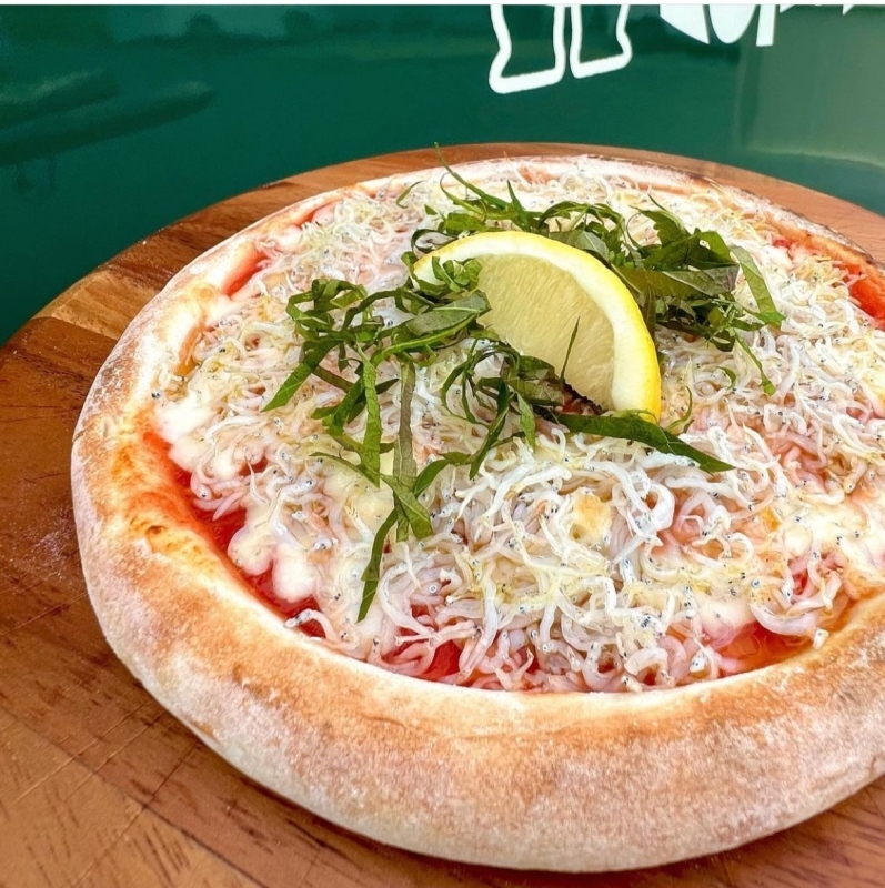 ○しらすたっぷりのしらすピザ しらす✕トマト=旨味マシマシ! 大葉とレモンでさっぱり食べられます。